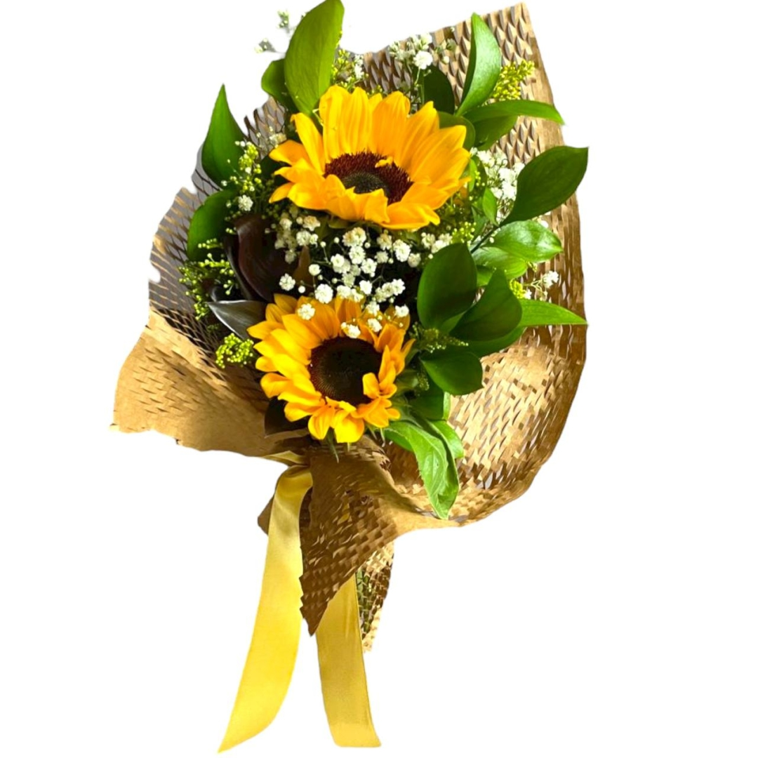 Um lindo buquê que traz frescor, energia e a alegria do sol em sua casa! Composto por dois girassóis e complementos, embalado e com laço de cetim.
