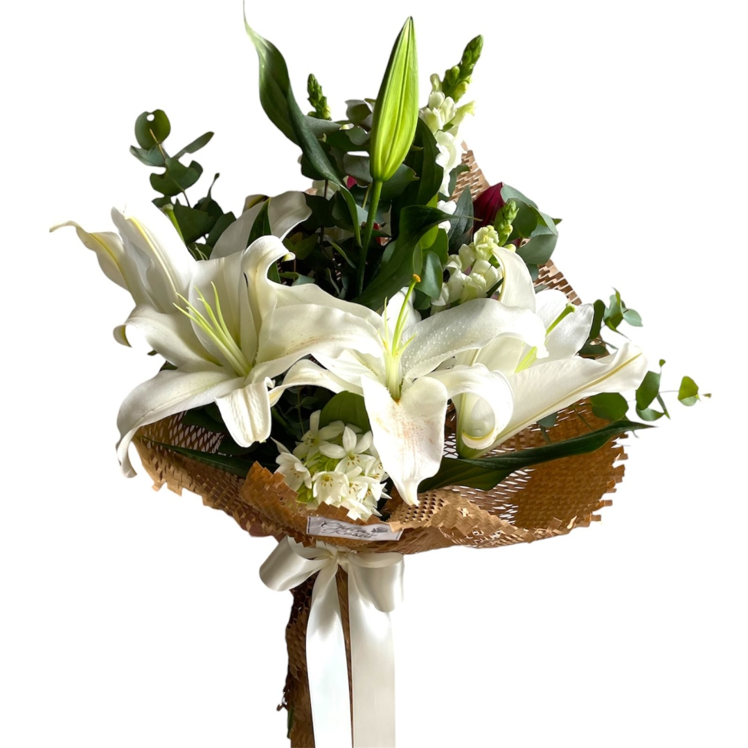 Encante com a sofisticação atemporal deste buquê composto por lírios brancos exuberantes e folhagens selecionadas. Cada haste é cuidadosamente arranjada em uma embalagem rústico-chic, complementada por um laço de cetim que realça sua beleza natural.
