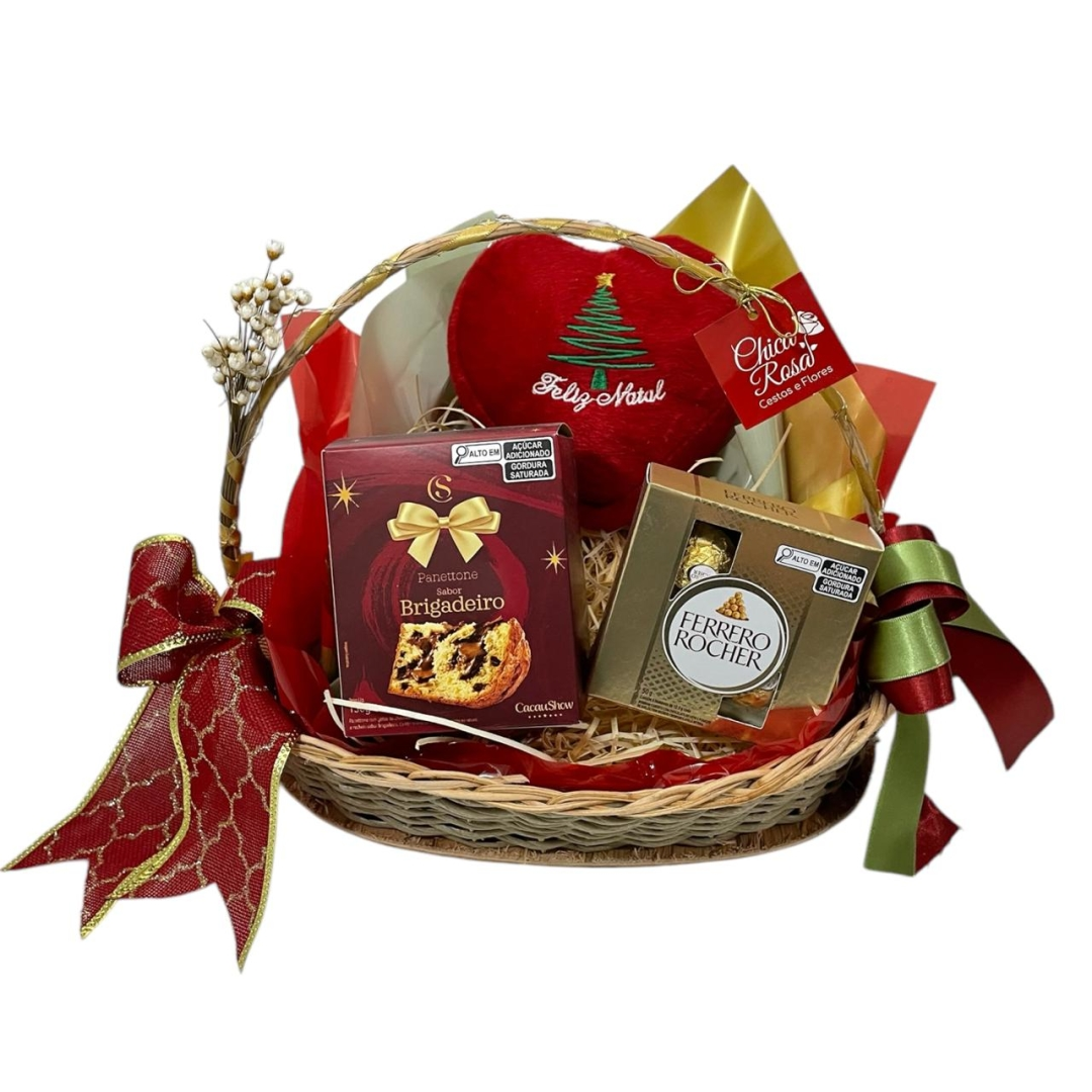 Uma cesta de vime, um coração de pelúcia tema Natal tamanho 14 x 14 cm, um panetone Cacau Show 130g , caixa de bombons Ferrero Rocher 50g