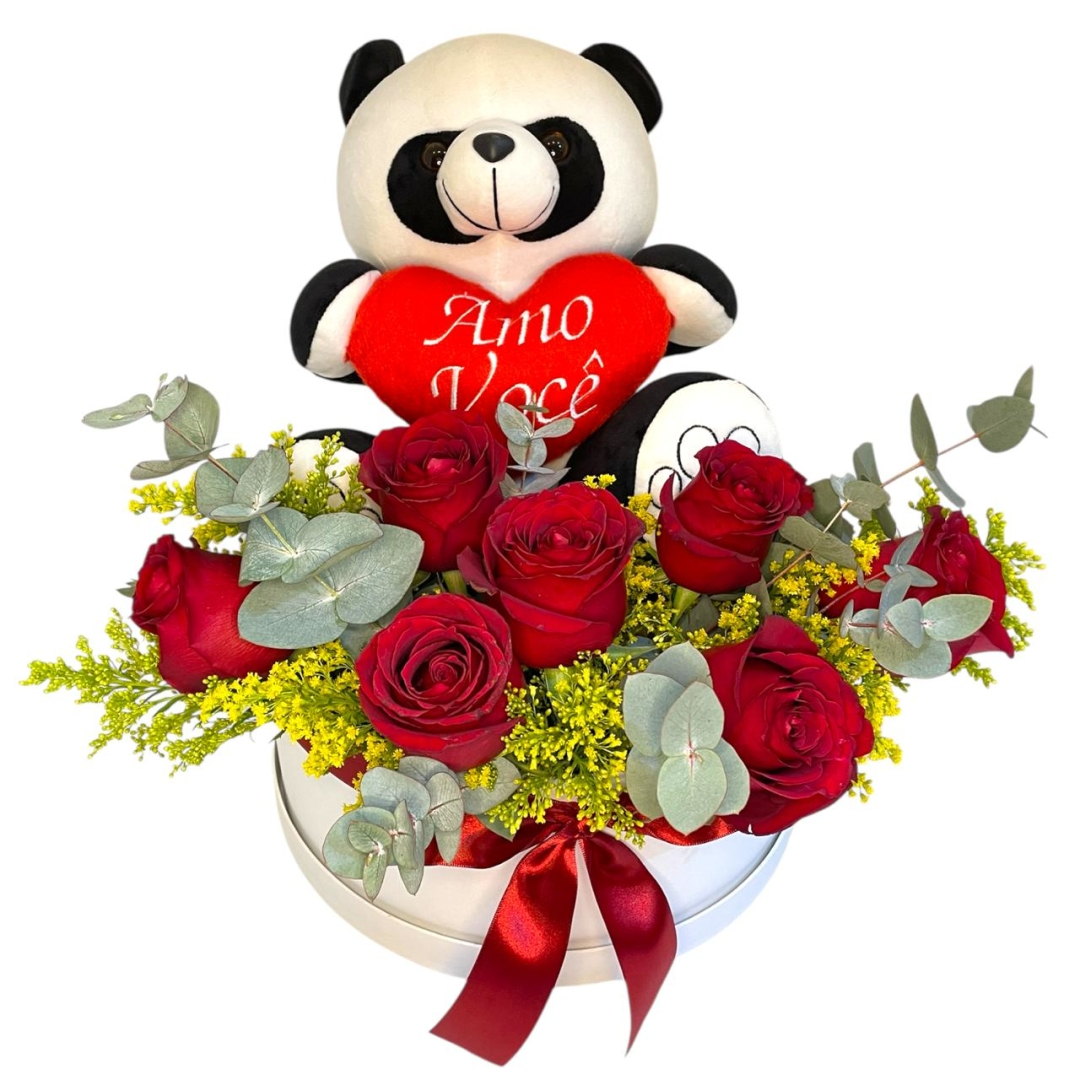 Arranjo encantador com 7 rosas vermelhas, folhagens e complementos delicados, acompanhado de um adorável panda de pelúcia (30cm). Tudo cuidadosamente montado em uma elegante caixa box com laço de cetim.