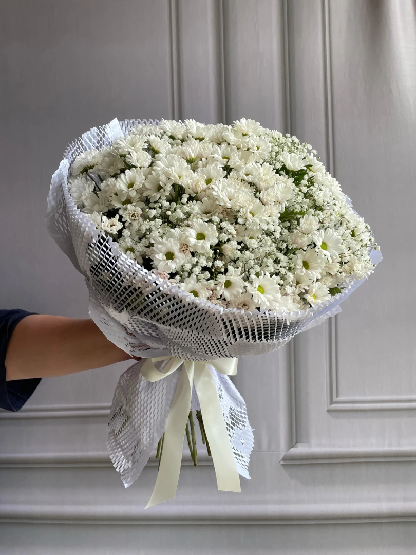 Delicado e sofisticado, este buquê é composto por margaridas brancas combinadas com a suavidade da gypsophila (mosquitinho). O arranjo transmite pureza, leveza e afeto, sendo ideal para presentear em aniversários, casamentos, agradecimentos ou para surpreender alguém especial em qualquer ocasião.